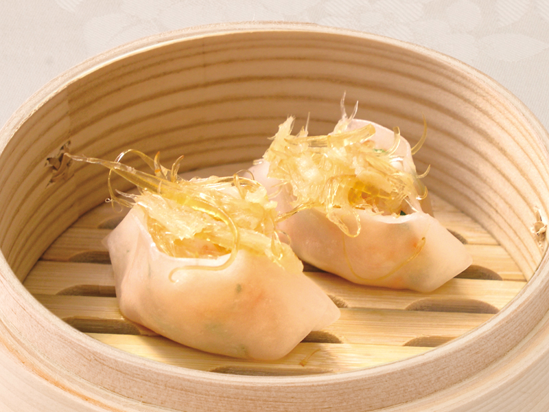 ふかひれ入り蒸しぎょうざ 菜香魚翅餃 \740(814)(2個) 古来より尊ばれる高級食材で コラーゲン豊富なふかひれを より手軽に楽しめるよう 海老あんの餃子に載せたおすすめの一品です。