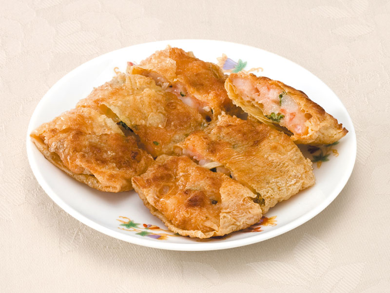 元祖海老のウエハース巻揚げ 威化明蝦巻 \560(616)(2本) 飲茶の菜香を代表する一品。 プリップリのえびと サクサクウエハースの食感、 アクセントには黄ニラの香りと たけのこの歯ざわり、 皆様に愛され続けている、菜香の一品です。