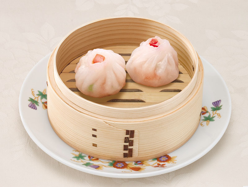 海老蒸し餃子 淡水鮮蝦餃 \340(374)(2個) 香港飲茶のスタンダード。 浮き粉という小麦のでんぷんで作った 透明な皮で包んだ蒸し餃子です。