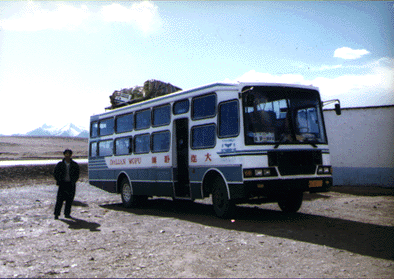 チベットに入るのに1番手っ取り早いのはどこかの土地からチベットの首都ラサ(拉薩)に飛行機で降り立つ方法。陸路ではネパールもしくは中国からバスに乗ってラサへ…となる。陸路好きの私が選んだのはバスルートである。ゴルムドからは毎日ひっきりなしにラサ行きのバスが客引きをしている。そのバスに中国人のフリをして乗ってしまうのは一番安上がりだが非合法である。外国人はパーミッション(入境許可証)を取ってチベット入りするのが合法手段。しかし非合法が150〜250元に対し、合法では1000元以上と値段がべらぼうに違うので、非合法でチベット入りする外国人は後を絶たない。チベット入境後、何かのトラブルに巻き込まれた場合、『入境記録』のない外国人(すなわち非合法の入境者)は面倒なことになる。さんざん悩んだあげく、私はやはり合法ルートを取ることにした。1180元であった。一応値切ってはみたが、合法=役所絡みなのでやはり無駄であった。それだけ高い料金を払ったからといって、特別なバスに乗れるのかと思ったら大間違い。バスは中国人、チベット人と一緒の何の変哲もないオンボロバス。私以外の彼らは250元で乗っているのかと思うと、かなり悔しい。