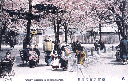 20世紀初頭の横浜公園。桜の下で子守りをするあどけない少女にくつろぎのひとときを見る。