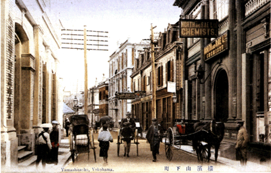 力車・馬車の行き交う洋風の街並み、明治末の旧居留地・横浜山下町。メーンストリート(本町通り)には外国人の経営する商社・銀行・店舗が並んでいた。現在は中華街・東門のある付近のおよそ90年前の光景。