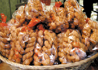 中華街のお菓子で、一番皆さんに親しまれているのは、やはり月餅(げっぺい)でしょうか。表面が艶やかで鮮明な模様を持ち、あんを包んだお菓子です。日本では、一年中売られているもので、特に季節を感じずに食べられているのですが、中国では、陰暦8月15日の中秋節の頃によく食べます。昔からの風習で、中秋節には種々の果物や野菜、そしてこの月餅を供え、家族の円満を祈るそうです。横浜中華街でも、この頃になると毎年、特別な月餅に出会うことができます。2001年、今年の中秋節は10月1日です。十五夜のお月さまを見ながら大きな月餅を食べるという至福の時が待ち遠しいです。それまでの間は、ほかの中華菓子に目を向けてみてはいかがでしょうか。本当に種類が豊富で、驚かれることと思います。マップに、オリジナリティあふれるお菓子を並べてみました。 どうぞご覧ください。