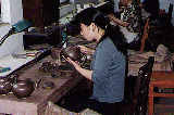上海から車で4時間、太湖の西岸にある焼きものの町、宜興は鉄分を含む「紫砂」という鉱石を産します。これを地中から掘り出して粉砕し、水を加えて粘土状にしたものが紫砂泥。この紫砂泥の特長は、可塑性がよく、生素地は強度が高く、乾燥・焼成の収縮率が小さいこと。紫砂泥の色は、もともと紫泥・緑泥・紅泥の3種ですが、今は技術革新と需要により混ぜ合わせることも多く、製品は「五光十色」というくらい多色、部分的に色を使うことも見られます。