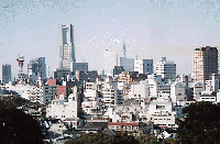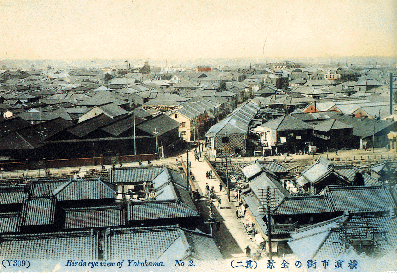 元町の家並みから堀川を挟んで横浜居留地・関内を見る。中央の前田橋の向こうに中華街が形成された。およそ100年後、現在の堀川には高速道路が架かり、はるかに「みなとみらい」地区のビル群を望む。