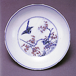 「豆彩」は中国陶磁器の一種で、明朝の成化時代(15世紀後半)に始まります。文様の輪郭を淡く細い青花で下絵付けし、釉を施して本焼きにした後、5、6種類の上絵の具を塗って焼き付けた色絵磁器で、中国では「闘彩」と書き表します。「闘」には、競い合うという意味があります。