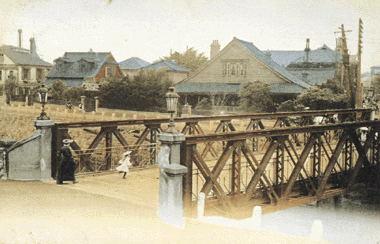 輪回しで遊ぶ外国の少女、明治末の状景。山手から谷戸坂を下り橋を渡ると居留地横浜・山下町。堀川の向こう三角屋根の家はヘボン式ローマ字を考案したヘボンの住居。百年後の今、橋は左手に移され、川の向こうにはマリンタワー。