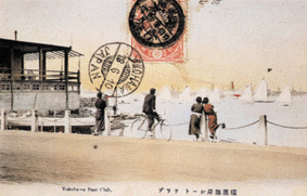 1910年6月18日の消印のある絵はがき。旧居留地横浜のバンド(海岸通り)で沖のヨットをながめる少年たち。港では居留外国人によるヨットレースが行われた。山下公園ではいま、ドラゴンボートレースが横浜の夏を告げる。