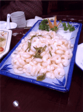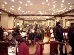 杭州を訪れる人の口から必ず出る店【張生記】へ。オーダーを取っている最中に前菜が出てくる、速い。ヘビも食べた、香辛料で味付けして揚げてあり、臭みもなくおいしい。それにしてもこの店は大きい、2千人近く入るという、調理場は2百人近いそうだ!横浜中華街【菜香新館】の4倍の規模である。安くてボリュームがある、「薄利多売は質を下げる」というがそれをまったく感じさせないし料理もすこぶる速い、見習うべきところだ。 |