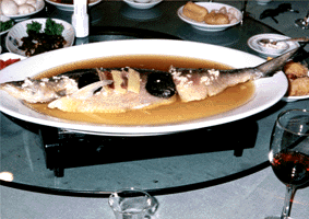 【蘇斬匯】は上海の日本人もよく利用するレストラン、《金華ハムの蜜煮》と《蒸し》がここの売り。はこの地方にしかいない魚で、昔は馬で北京に運び皇帝に献上されたそうだ。味は白身魚と青魚の中間か。ここのナマコは大味、【菜香新館】のナマコは特級品を使っているのでおいしい、つい比べてしまう。タケノコの炒めと豆苗の炒め、やはり旬のものはうまい。 |