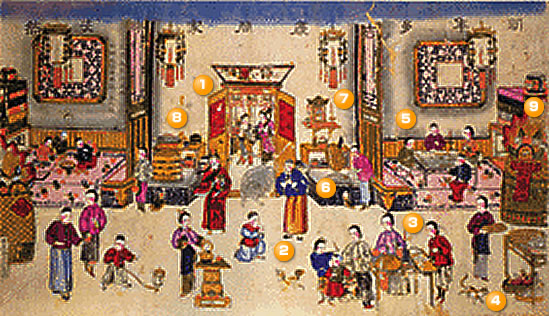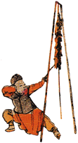 | 図の右に置かれたかごは財宝を入れた「財宝 (財宝かご)」、蓄財は人々の望むところ。 年明けに家の外で爆竹を鳴らします。古人は青竹を火に放り込んで 破裂させてその音で邪悪を追い払いました。 |