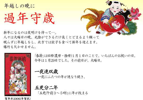 | 北方ではこの夜、婦人たちが卓を囲んで餃子作り、餃子はお金のシンボル。若い女性が立って皮をのし、中央の女性は座って包み、左の母親は、「糖葫蘆(サンザシの実などを竹串に刺して蜜をまぶして固めた甘い菓子)」を持った子どもの相手をしています。 | |