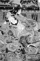 | 唐代はシルクロードがひときわにぎわった時代です。西方からゾロアスター教、キリスト教、マニ教、イスラム教などの異国の宗教をはじめ、さまざまな文物や技術が中国に伝わりました。世界的な国際都市となった都長安では空前のペルシア(胡)・ブームが巻き起こり、貴婦人の心を魅了しました。胡食・胡服を愛してやまなかった楊貴妃(719―756)は舞の名手でもありましたから、当時流行した西方のダンス、くるくると急回転する胡旋舞(こせんぶ)をマスターしていたかもしれません。馬毬(ポロ)もペルシアで起こったもので、長安の貴族の間で大流行しました。こうした記述から目に浮かんでくるのは、細身でしなやかな身のこなしの楊貴妃かもしれません。しかし、彼女の時代にはたいそうふくよかな体型が理想とされていました。 それでは、当時の流行を砂漠の大画廊、敦煌に探してみましょう。敦煌の仏教美術は質・量、聖・俗ともに情報の宝庫です。壁画や彫像を時代順に眺めていくと、開元天宝時代(713―756)の仏・菩薩そして俗人もふっくらとした量感で表され、長安の理想美を色濃く反映していることがわかります。胡旋舞の様子も敦煌壁画からうかがい知ることができます。7世紀、第220窟の阿弥陀浄土図(南壁)および薬師浄土図(北壁)には、伎楽を奏でる菩薩のオーケストラにあわせて、長いスカーフをなびかせくるくる回転している舞人が描かれています。胡旋舞は西域の康国(サマルカンド)が得意とした舞で『新唐書』に「胡旋舞は風のように旋転する」とあり、唐の代表的詩人、白居易(白楽天)も、「疲れを知らずに左旋右転する胡旋女」に注目し、詩を詠んでいます(『新楽府』五十篇の第八「胡旋女」)。