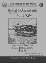 演奏は4月9日にカラカスの国立美術館のホールで、12日にはメリダのロス・アンデス大学のセサール・レンヒーホ劇場で行いました。在ベネズエラ日本大使館、ロベルトさんとその家族、私がベネズエラ政府で働いていた当時に知り合った友人、それぞれの紹介で多くの人に集まっていただきました。演奏曲目は〈六段〉〈千鳥〉〈元禄花見踊り〉〈祝の曲〉〈ソーラン節〉〈さくら〉〈岩清水〉と、ベネズエラの民謡〈サバナ〉でした。「サバナ」は「平原」という意味で、日本の〈さくら〉のような、ベネズエラの人ならだれでも知っている有名な曲です。この曲をロベルトさんの友人で東京芸大の博士課程に当時留学中のベネズエラ人のロドリゴさんに、私たちの演奏旅行のために特別に尺八と琴と三味線のために編曲していただきました。プログラムを事前に作成して演奏会場で配布していただきました。私たちが紋付の着物で正装して演奏を始めると、うろうろしていた子どもたちも動かなくなるほど、見たことも聞いたこともない尺八・琴と三味線の音色に聞き入ってくれました。聴衆が最も感動したのは、加藤先生と高島さんが演奏した〈岩清水〉でした。演奏会は好評で、旅費の一部を負担するので再度演奏に来てほしいと要請があったほどでした。