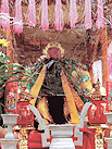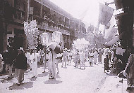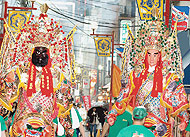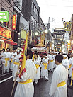 | 小雨の中の関帝誕。05年から、ご神体を載せた神輿が中華街を巡行するようになった。06年に、関帝廟で関帝を守る関平将軍と周倉将軍の張り子人形(2.5メートル)がデビュー。獅子舞は国術団が演ずる。 |