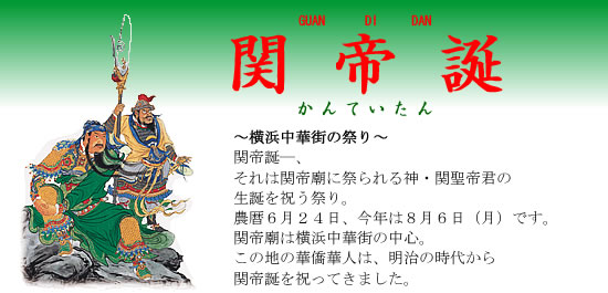 | ●拝神儀式と新生児祈願 11:00〜12:00(関帝廟) ●神輿の巡行 17:00〜19:00(中華街全域) 関平将軍・周倉将軍の張り子人形や、 伝統芸能・高足踊りの「群龍高 陣」が参加。雨天中止。 主催: 横濱中華街關帝廟 045-226-2636 http://www.yokohama-kanteibyo.com |