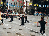 9月 運動会 山下町公園で運動会。子どもたちの手形が押された「旗」がはためく下で大熊猫クラスが、中国伝統の剣舞を披露。 |