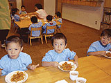 お昼ごはん (AM 11:45) 「老師吃飯(先生、いただきます)、同学吃飯(みなさん、いただきます)。」昼食は手作り、きょうはみんな大好きなハヤシライス。 |