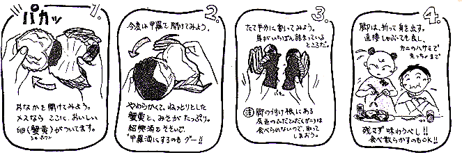 | 本名:中国モズクガニ 別名:大閘蟹(ダアヂャアシェ) 通称名:上海蟹(シャンハイガニ) 住所(産地):中国江南、江蘇省上海近くの陽 澄湖(淡水湖) 年齢:2〜3歳(最近は養殖された温室育ちが多い) 身長:握りこぶし大 体重(規格):オス150グラム以上、メス125グラム以上 性格:どうもう、けんかっ早い(かごに縛って入れないと腕引き ちぎるまでけんかする) 職業:稲穂ハンター(黄金色に実った稲が大好物。稲を食べに 田んぼへ来た所を捕獲されてしまうというちょっと間抜けな一面を持つ) |