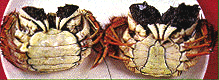 | 右がオスで、左がメス。おなかの形状とツメの大きさで区別する。オスはひと回り大きく毛深く、フンドシをつけているように見える。メスは小ぶりでつるんとしているので区別しやすい。10月はメスのタマゴ、11月はオスのみそが旨い。特に10月下旬〜11月上旬の上海蟹は絶品! |