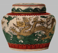 「豆彩」は中国陶磁器の一種で、明朝の成化時代(15世紀後半)に始まります。文様の輪郭を淡く細い青花で下絵付けし、釉を施して本焼きにした後、5、6種類の上絵の具を塗って焼き付けた色絵磁器で、中国では「闘彩」と書き表します。「闘」には、競い合うという意味があります。