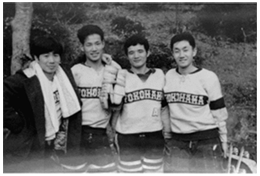 1961年ころ、アイスホッケーの仲間と(左端) |