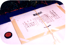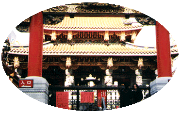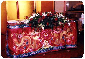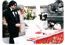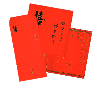 | 中国で紅はおめでたい色。香り立つ招待状で、もらった人もなぜかウキウキ。 | 関羽様が祭られた関帝廟での挙式。 |