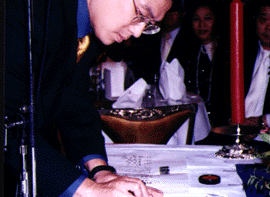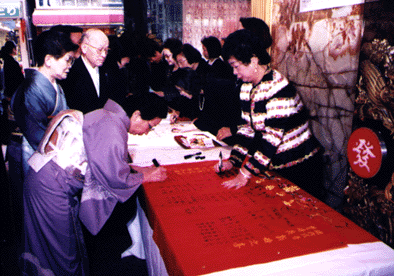 | 14:00芳名帳の代わりに赤い布にサインします。気軽に書けるのが良いですね。 | 15:05中国式ならではの三礼の儀 | 15:10友人代表の二人が新郎新婦の証婚人となって結婚証書に捺印をします。 |
