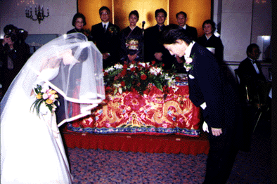 | 今までの感謝の気持ちを込めて両親にお茶をあげます。これも儀式のひとつ。 | 挙式開始。新郎新婦の入場を待つ。 |