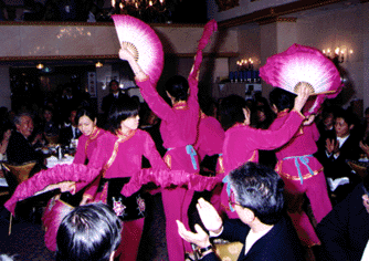 | 15:35大きな桃まんじゅうを持ち上げると、ミニ桃マンがたくさん隠されていてゲストひとりひとりにサービスされます。 | 16:00祝福の気持が食欲と笑顔に表れる豊かな席 | 16:30中華街の女の子たちによる「祝いの舞」。 |