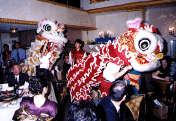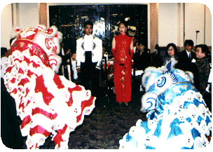 | 17:00お色直しは対照的な淡い色のチャイナドレスで。 | 17:45中国獅子が祝福。宴はまだまだつづく。 |