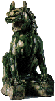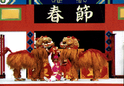 獅子――この外来動物の造形は、早くに中国の文化に吸収され、西洋のライオンとは異なった造形、中華民族の特色を持つ造形として各種装飾図案に応用され、「吉祥」の意味を与えられてきました。肉が盛り上がり、胸を張り猛々しい、しゃがみこんだ姿と頭部の巻いた毛という、中国の獅子の独特の形態は唐代に始まり今に伝えられるといいます。 獅子舞は、後漢時代に書かれた『漢書・礼楽志』の〈孟康注〉にあるように、古くから舞われていたといいます(異説多い)。獅子の霊力を借りて「招福駆邪(福を招き邪をはらう)」の気持ちを表す獅子舞は生活に欠かせないものになっています。