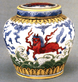 「豆彩」は中国陶磁器の一種で、明朝の成化時代(15世紀後半)に始まります。文様の輪郭を淡く細い青花で下絵付けし、釉を施して本焼きにした後、5、6種類の上絵の具を塗って焼き付けた色絵磁器で、中国では「闘彩」と書き表します。「闘」には、競い合うという意味があります。