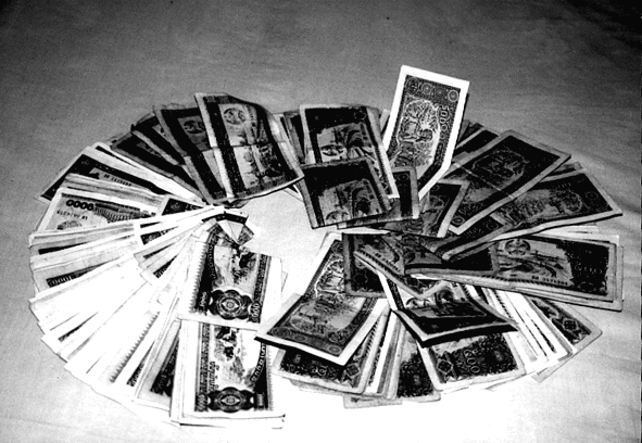 ビエンチャンと聞いて、「あぁ、ラオスの首都ね…」なんて即答できる人は少ないであろう。私も自分がラオスに行って初めて覚えた街である。というわけで、なんの潜在意識も偏見も持たずに訪れたビエンチャンの第一印象は、というと…しょぼい…の一言であった。街はとにかく小さく、高い高層ビルはひとつもない。車の量、人の量を見ても、これが一国の首都だなんて、まさに「しょぼ」すぎて信じられなかった。 到着の日は日曜日。銀行も両替所も全て休み。ツアーでもないので、仕方なく(?)、闇両替に出かけた。で、またまたびっくり。ラオスの通貨単位は「キップ」、私は交渉の末、50ドル(US)札一枚を両替すると、「186、000キップ」になった。18万6千…しかも一番大きい札は1000キップ、ほとんどの金は、100キップ、500キップ札で渡された。考えてもみてほしい、100円、500円札だけで18万…ご想像の通り、一枚の札はとんでもない札束に変身を遂げたのである。小市民の私は、ゲストハウスの部屋に戻り、札を広げて記念撮影をした!