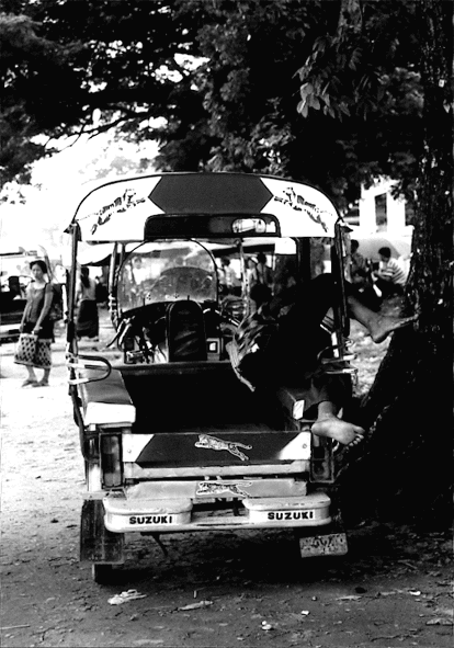 夕飯(ラオスに入って初の食事)を食べにメコン川沿いの屋台に行った。コーラ、ビール、フルーツ、野菜などが氷の上に並べられ、とても涼しげである。普段私は酒をおいしいと思ったことなど一度もないし、ひとりで飲む習慣もないのだが、その時はビアー・ラオというラオス産のビールを注文した。大正解であった。メコンを目の前に、キンキンに冷えたビアー・ラオはものすごいおいしさで、今まで飲んだ酒の中で一番おいしかった。一緒に食べたハーブや香辛料たっぷりの炒め物も、まさにピッタリで、屋台のおばさんもやさしくて、急にラオスの印象は最高になった。人間なんてそんなもんである。 7月のラオスは雨季に入ったばかりだった。ある日の夜、日本に電話をしようと、国際電話局に行った。その日は一日ピーカンの大晴れだったのに、数分の電話の間に南国特有のスコールが降り出した。しばらく待っていたが止みそうもないので、外に出て愕然とした。ほんの7〜8分ほどの時間で、街中がメコン川になっていたのである。深いところは膝ぐらいまで水が上がっていた。雨脚がおさまらないので、店の軒先ごとに雨宿りをしながら走り出した。途中、走り出したはいいが、次の雨宿り場所が見つからずオタオタしていると、横から女の子が何か叫んでしきりに手招きをしている。走りよるとどうやらここで一緒に雨宿りしようと言っているらしい。彼女一人がやっとの小さな軒先に私を招き入れてくれたのである。私がラオ語ができないのがわかると、英語で「旅行?」と聞いてきた。話してみると彼女は地元の高校生。「ラオスはどう?」と聞かれ、「とてもきれいなところだね。」と答えると、彼女は急にとてもかわいい笑顔を浮かべ、「ありがとう。旅行楽しんで!」と言った。私も覚えたてのラオ語「コープ・チャーイ!(ありがとう)」で答えた。またしても「イイなぁ、ラオス」って思ってしまうのであった。