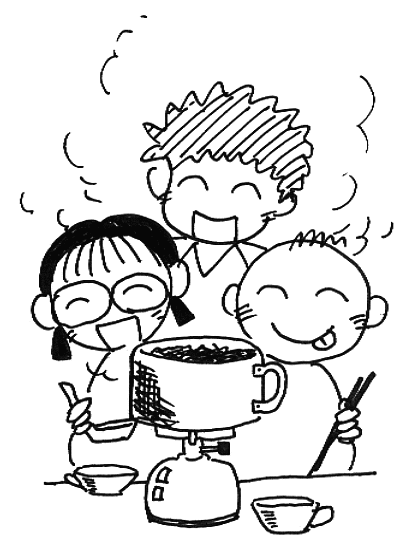 至福の山ごはん 前日までの悪天候がウソみたいに晴れた、10月21日。奥多摩は浅間嶺で、芋煮会を決行することにした。本来河原で行うのが基本だけど、トレッキングクラブと銘打ってる我々としては山に行かねばならないのだ! 武蔵五日市駅からバスで、景色がほのぼのしてきたころ登山口に到着。日本手拭いをほっかむりした正調日本的おばちゃんが軒先で作物を乾燥させたりしてる脇道を静かに登っていくとまだ紅葉には早い薄暗い緑のトンネルのゆるやかな尾根道になった。ここには馬頭観音という、頭に馬を乗っけた石の道祖神があちらこちらにあり、のんびりムードなので思わず休憩してしまう。しかしおなかの虫は容赦なく、あわてて山頂に向かうのだった…。ようやく山頂真下の広場に着き、早速芋煮の支度開始だ!あらかじめ下煮をした里芋に牛肉(山形以外は豚肉らしい)、葱、コンニャク、きのこを入れて、酒、砂糖、醤油で味付け。肌寒い時期の山は温かいものが何よりのゴチソウなのだ。豚汁、鍋焼きうどん等は定番で、去年の忘年山行ではキノコ鍋と冷酒で、違うグループのおじさん達を羨ましがらせてしまった。荷物が重くなるので日帰り低山でしかできないけど…。焼きビーフン、焼きうどん、お好み焼きと焼物3か月連発てのもやったし、おいしかったけど茹でる時間が待ちきれずにツラかった、トマトソースのパスタとチーズにワインというのもあった。春は山菜の天ぷら、夏はソーメンとかいいよな。山で食べれば何でもおいしく感じてしまうと言えばそれまでだけど、気の合う仲間と澄んだ空気、すばらしい景色に囲まれて食べる山ごはんはやっぱりサイコーなのである! さて来月はどの山行って、何食べようか? |